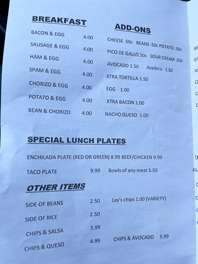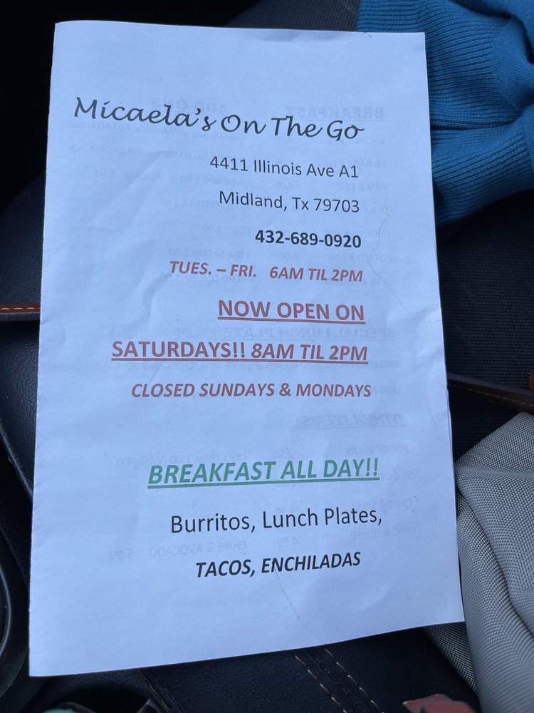 Micaela's On The Go is a Mexican restaurant located in Midland, TX, offering a variety of delicious options for breakfast and lunch. This casual and quiet spot is perfect for a quick meal on the go or for dining in with friends and family. The menu includes classic breakfast options like Bacon and Egg or Sausage and Egg, as well as special lunch items such as Chile Relleno Plate and Enchilada Plate. Don't miss out on their tasty Lunch Burritos, including Bean and Cheese Burritos, Combo Burritos, and Asadero Burritos. With options for takeout, delivery, and catering, Micaela's On The Go is a convenient and tasty choice for Mexican cuisine in Midland. The restaurant also accepts credit cards and Apple Pay for added convenience. Experience the flavors of Mexico at Micaela's On The Go today!